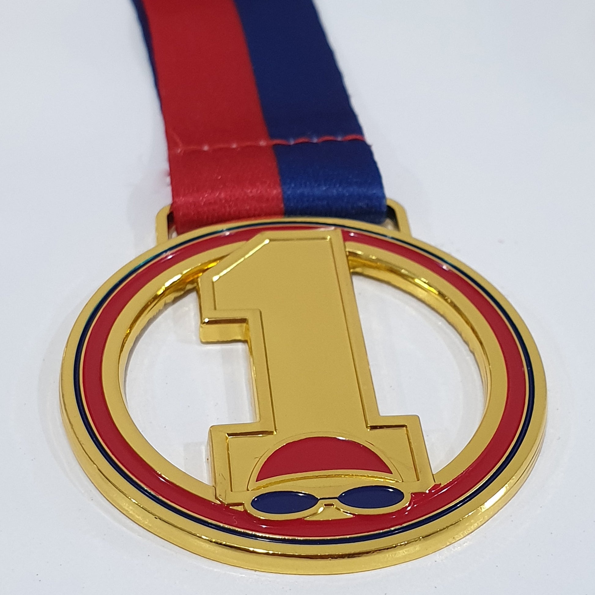 50 x 3mm heavyweight medal, featuring the famous "Cap & Goggles" logo, with infill enamel to the front and area for engraving to the back. Available in Gold, Silver and Bronze, complete with blue & red ribbon. Supplied bagged.